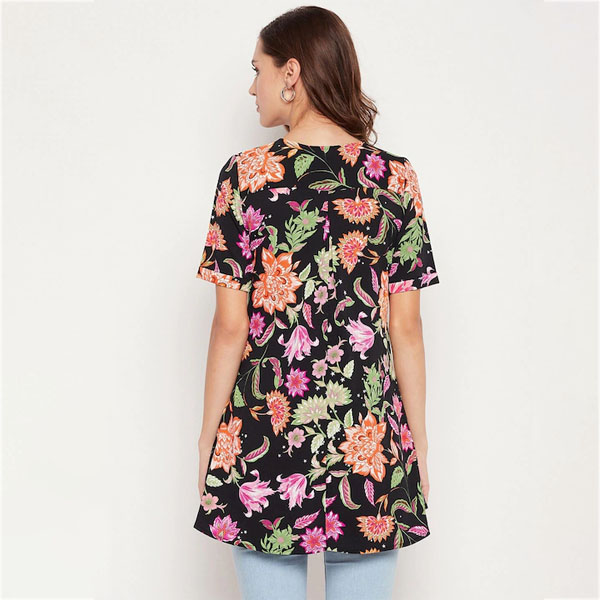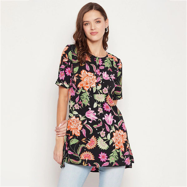 Black and pink printed tunic ,has a round neck, short sleeves, button closure