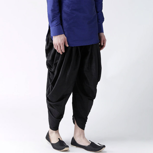 - Black solid dhoti pants, has an elasticated waistband with drawstring closure and pleats in the front