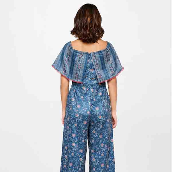Blue and red printed basic jumpsuit ,has a round neck, short sleeves, 2 pockets